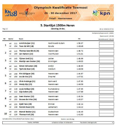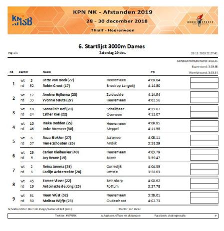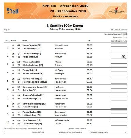 Zaterdag is de tweede dag van het NK Afstanden in Heerenveen. Op het programma staan de 500 meter dames, de 1500 meter heren en de 3000 meter dames.