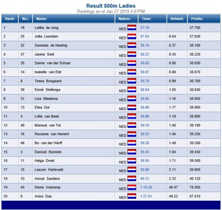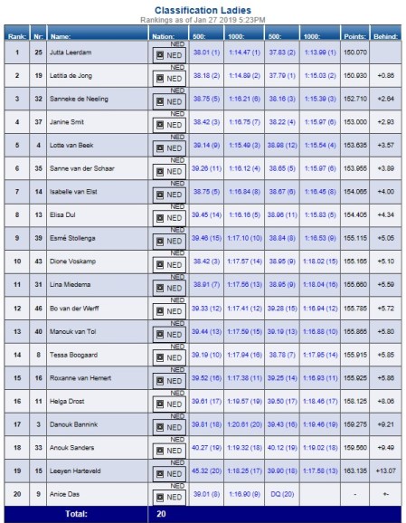 Letitia de Jong deed zondag op de tweede 500 meter een poging om dichter in de buurt van de latere winnares te komen. Ze won in de supersnelle tijd van 37’79 maar ook Leerdam perstte er een 37’er uit waardoor de tijdwinst beperkt bleef. Bovendien was De Jong’s afsluitende 1000 meter met 1.15’03 bij lange na niet snel genoeg om Leerdam van de titel af te houden.